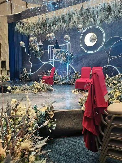 阿宝的婚礼现场布置得可谓是相当浪漫。整个场地被装饰得五彩斑斓,鲜花、气球、彩带随处可见。尤其是舞台背景,用阿宝的经典歌曲《小苹果》作为主题,让人一眼就能感受到婚礼的喜庆氛围。而阿宝和妻子的婚纱更是亮点,阿宝的妻子穿着一件白色婚纱,优雅大方,而阿宝则穿着一套黑色西装,显得成熟稳重。